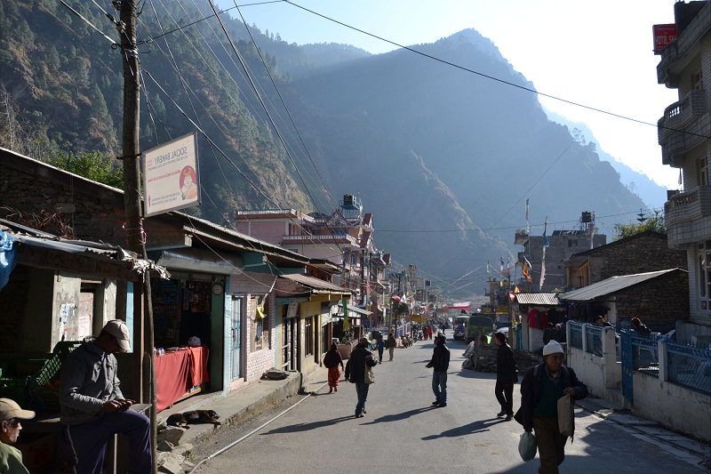 Jätimme pikkuhiljaa Kathmandun savut ja saasteet taaksemme, ja jo melko pian horisontissa siinsi Langtangin ja Manaslun vuoristot. Tie alkoi laskeutua alas. Trisuli Bazaarissa tie haarautui kahtia, toinen johti Pokharaan ja toinen Syabrubesin kautta Tiibetiin. Kaistoja oli tämän jälkeen enää yksi, mutta se oli asfalttipäällystetty. Liikennekin väheni huomattavasti.