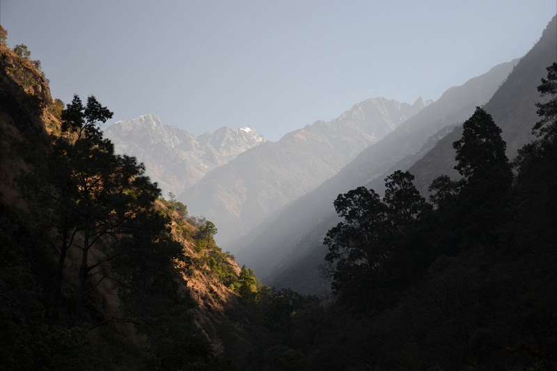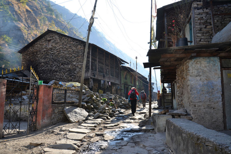 Tie erkani autotiestä heti Syabrubesin kylän jälkeen, ja tunnelma muuttui välittömästi. Ylitimme Langtang Khola -joen riippusiltaa pitkin, ja pääsimme vaelluspolulle. Autojen häly ja pakokaasut jäivät taakse, ja kosken pauhu täytti äänimaailman. Joenuoma oli todella syvä rotko, eikä aurinko paistanut lainkaan sille puolelle, missä kävelimme. Ilma oli kuitenkin lämmin, ja jyrkät kivenmurikoista tehdyt portaat mutkittelivat ylös alas. Reidet ja pohkeet saisivat aikamoisen aamujumpan 1000 metrin nousussa.