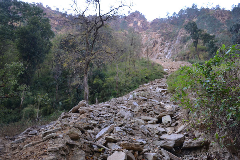 Opaskirjojen ja nettifoorumeiden kuvailut ”roadtrip from Hell” -tyyppisestä ajomatkasta olivat kyllä reipasta liioittelua, ainakin jos vertaa viime vuoden Annapurnalla kokemiini höykytyksiin vuoristoteillä! Tietä on tosin viime aikoina korjattu, joten ehkä huhut olivat vanhoja. Vain parissa kohtaa asfaltin katkaisi maanvyörymä (pienen omakotitalon kokoisia bouldereita oli vierähtänyt ylempää vuorelta), mutta muuten meno oli tasaista. Rotko tien vieressä oli syvä, mutta näköesteenä oli onneksi kasvillisuutta, joten ei pahemmin huipannut katsoa reunalta alas. Kuski ajoi kuulemma harvinaisen reippaasti, pääsimme parissa kohdassa jopa 60km/h vauhtiin, mutta keskinopeus lienee ollut lähempänä 20km/h.