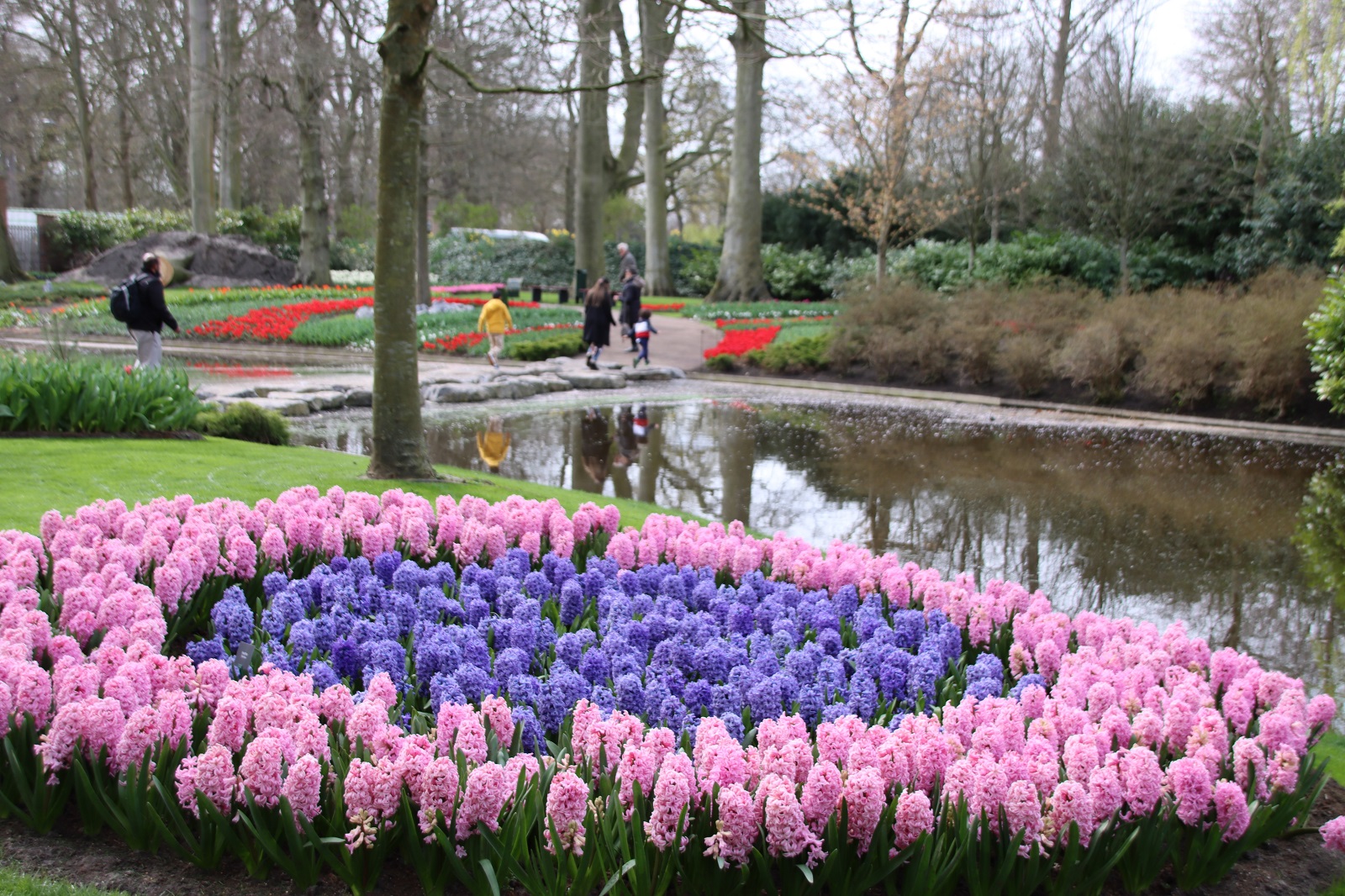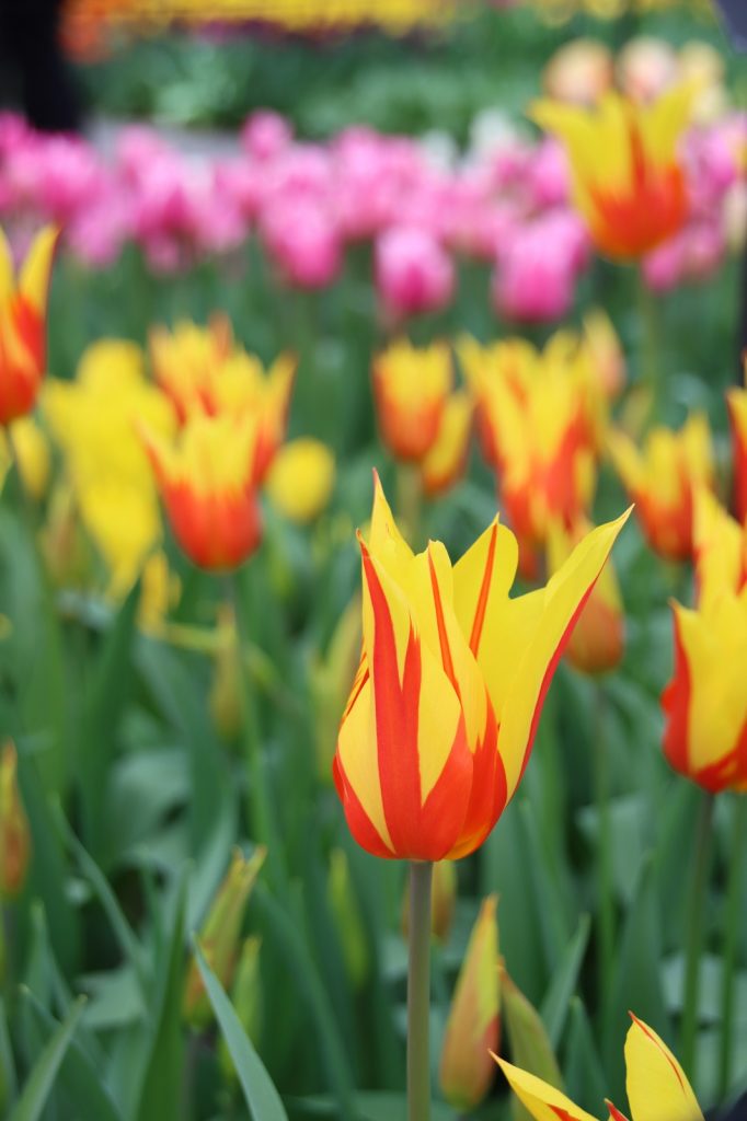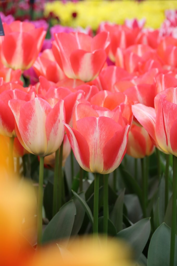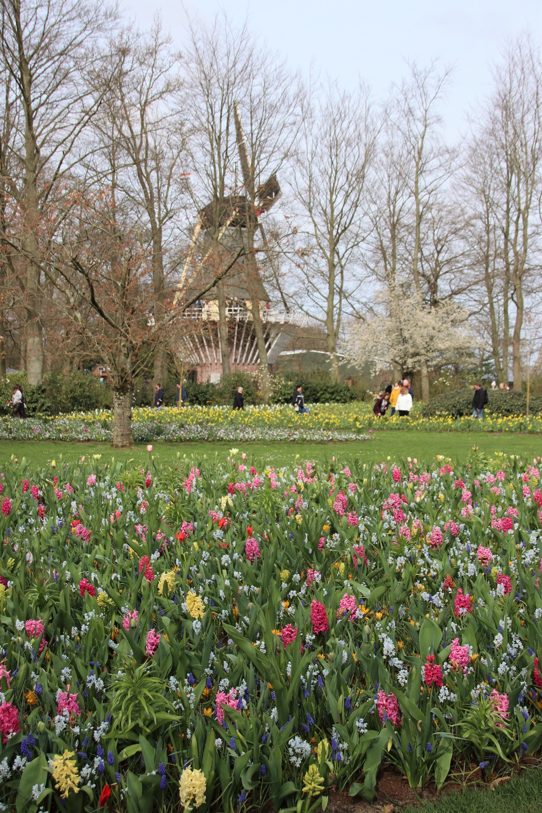 Me vierailimme Keukenhofissa maaliskuun lopussa, jolloin mm. hyasintit olivat komeimmillaan. Myöhemmin puistossa kukkivat suuret tulppaanit, joita pääsi nyt ihailemaan sisäpaviljongissa. Keukenhofissa on kolme paviljonkia, joihin kukka-alan ammattilaiset toteuttavat upeita näyttelyitä. Tulppaanien ja muiden sipulikukkien lisäksi lisäksi näytteillä on myös esimerkiksi orkideoja.